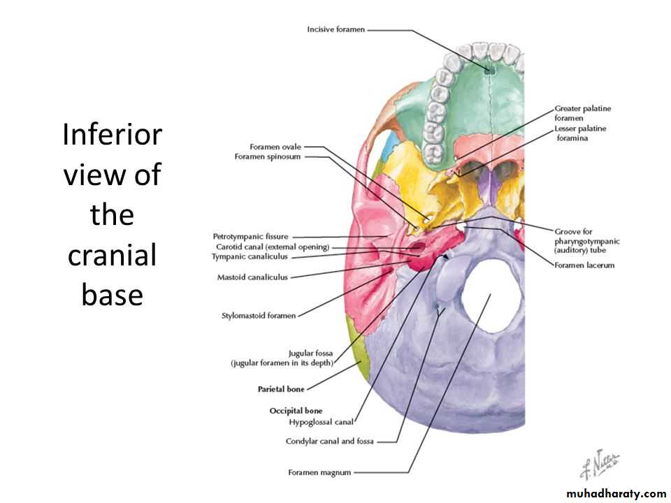 • Foramen ovale: for mandibular nerve ( CN V3) and accessory meningeal artery.