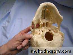 • Inferior orbital fissure: leads anteriorly into orbit; for zygomatic and infraorbital branches of maxillary nerve ( CN V2) , infraorbital artery , and communication between pterygoid plexus and inferior ophthalmic vein