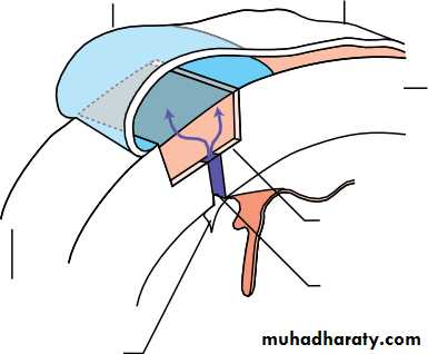 • THE LACRIMAL DRAINAGE SYSTEM (Fig. 1.4)• Tears drain into the upper and lower puncta and then into the lacrimal sac via the upper and lower canaliculi. They form a common canaliculus before entering the lacrimal sac. The nasolacrimal duct passes from the sac to the nose. Failure of the distal part of the nasolacrimal duct to fully canalize at birth is the usual cause of a watering, sticky eye in a baby. Tear drainage is an active process. Each blink of the lids helps to pump tears through the system.