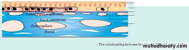 *Its basement membrane together with that of the retinal pigment epithelium (RPE) forms the acellular, Bruch's membrane, which acts as a diffusion barrier between the choroid and the retina.The retinal pigment epithelium