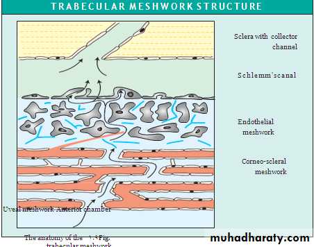 The angle formed by the iris and cornea (the iridocorneal angle) is lined by a meshwork of cells and collagen beams (the trabecular meshwork). In the sclera outside this, Schlemm?s canal conducts the aqueous humour from the anterior chamber into the venous system, permitting aqueous drainage. This region is termed the drainage angle.