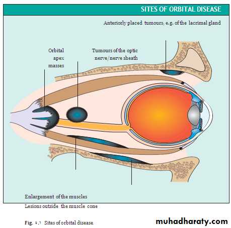 The eye lies within the bony orbit whose structure .The orbit has the shape of a four-sided pyramid. At its posterior apex is the optic canal which transmits the optic nerve to the brain. The superior and inferior orbital fissures allow the passage of blood vessels and cranial nerves which supply orbital structures. On the anterior medial wall lies a fossa for the lacrimal sac. The lacrimal gland lies anteriorly in the superolateral aspect of the orbit.Fossa for lacrimal glandSuperior orbital fissure Inferior orbital fissureZygomatic boneLesser wing of sphenoid Orbital plate of great wing of sphenoid