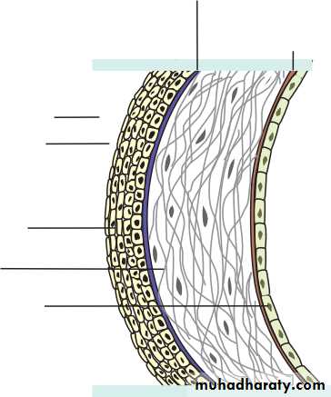 The cornea is 0.5 mm thick and comprises:1.The epithelium, an anterior squamous layer thickened peripherally at the limbus where it is continuous with the conjunctiva. The limbus houses its germinative?or stem?cells.