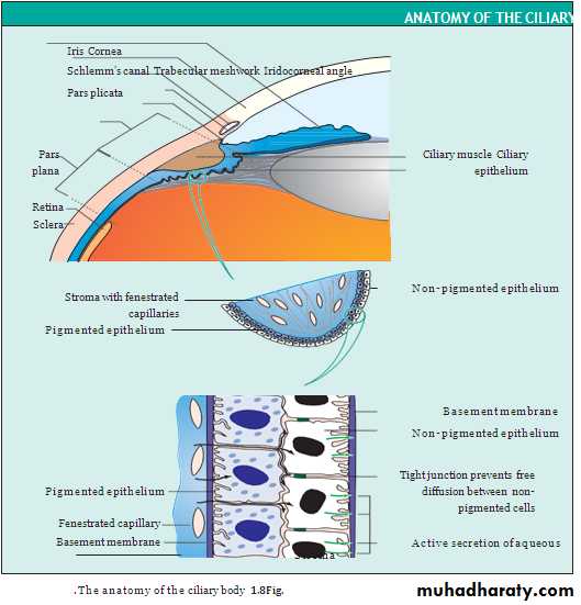The ciliary body lies anteriorly. It contains the smooth ciliary muscle whose contraction alters lens shape and enables the focus of the eye to be changed. The ciliary epithelium secretes aqueous humour and maintains the ocular pressure. The ciliary body provides attachment for the iris.