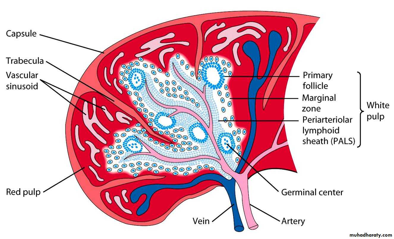 The spleen consist of trabicular vessels surrounded by the white pulp, then marginal zone which is covered by red pulp.The white pulp consist of lymphatic sheaths contains plasma cells (Igs), and T lymphocytes.