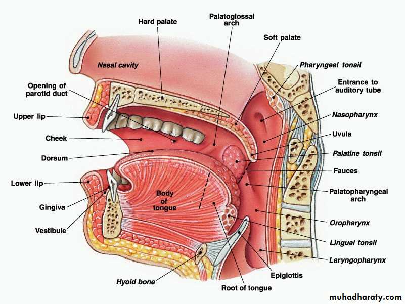 2- Oropharynx: This extends from the level of hard palate to the level of hyoid bone and opens anteriorly into the oral cavity. The palatine tonsils are situated in it's lateral wall. The free edge of the soft palate forms the palatine arch which separates the oral cavity from the pharynx.