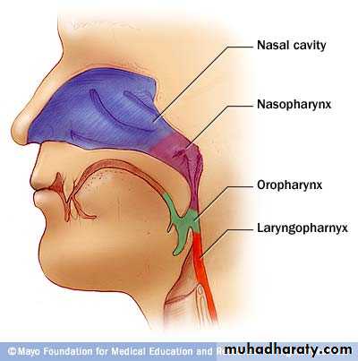 Nasopharynx: This extends from the base of the skull to the hard palate. It communicates anteriorly with the nasal cavities through the posterior nares (choanae). At the junction of the roof and posterior wall lies a small mass of lymphoid tissue called adenoids (nasopharyngeal tonsil). On the lateral wall, there are the openings of the Eustachian tubes. These tube connect the nasopharynx with the middle ear cavities, and are lined with ciliated columnar epithelium. Behind which are hollows called the fossa of Rosenmuller, which is the site of nasopharyngeal malignancy.