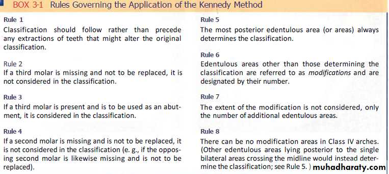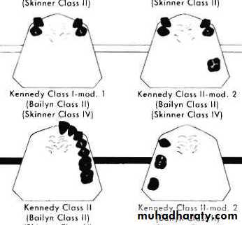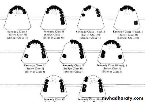 The most familiar classifications are those originally proposed by Kennedy, Cummer, and Bailyn.Beckett, Godfrey, Swenson, Friedman, Wilson, Skinner, Applegate, Avant, Miller, and others have also proposed classifications. It is evident that an attempt should be made to combine the best features of all classifications so that a universal classification can be adoptedThe Kennedy method of classification is probably the most widely accepted classification of partially edentulous arches today.