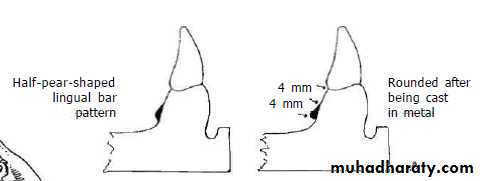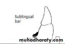 Characteristics and Location The sublingual bar is essentially the same half-pear shape as a lingual bar except that the bulkiest portion is located to the lingual and the tapered portion is toward the labial. The superior border of the bar should be at least 3 mm from the free gingival margin of the teeth. The inferior border is located at the height