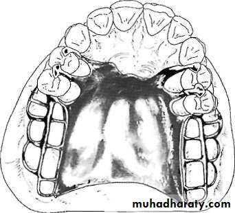 (1) Parallelogram shaped and open in center portion. (2) Relatively broad (8 to 10 mm) anterior and posterior palatal straps. (3) Lateral palatal straps (7 to 9 mm) narrow and parallel to curve of arch; minimum of 6 mm from gingival crevices of remaining teeth. (4) Anterior palatal strap: anterior border not placed farther anteriorly than anterior rests and never closer than 6 mm to lingual gingival crevices; follows the valleys of the rugae at right angles to the median palatal suture. Posterior border, if in rugae area, follows valleys of rugae at right angles to the medianpalatal suture