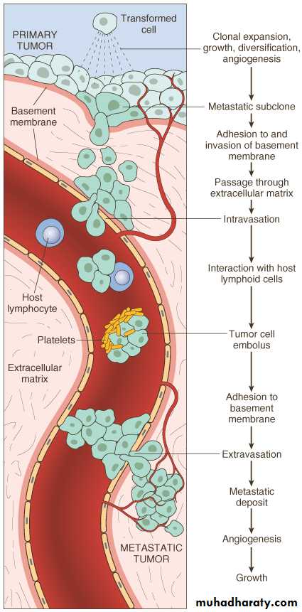 Malignant cells have the ability to emerge themselves between adjacent normal cells and invade the surrounding tissues ( first loose connective tissue).For epithelial tumors the first step should break the basement membrane