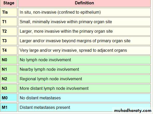 is based on the size of the primary lesion, its extent of spread to regional lymph nodes, and the presence or absence of blood-borne metastases.The main staging system have used is TNM staging