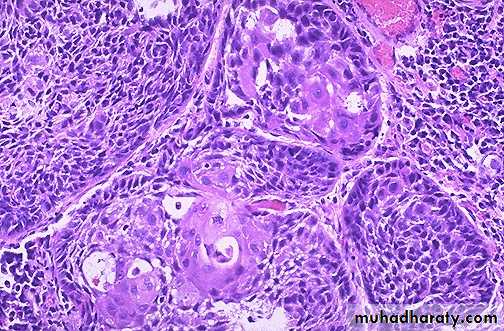 Tumor Giant cell formation : possessing only a single huge polymorphic nucleus and others having two or more large, hyperchromatic nuclei