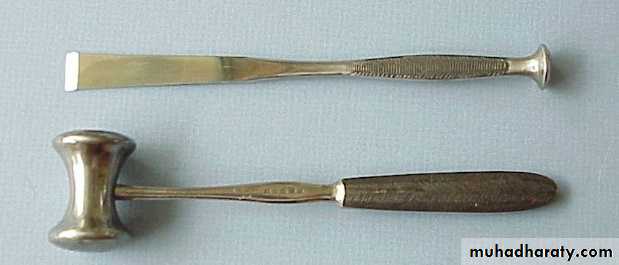 This is another method for removing bone especially when large piece of bone need to be removed .we have many size and lengths of chisels .. chisels have a sharp monobeveled working end used to cut bone , bi bevelede called osteotome, may be used for splitting bone or teeth , cutting of bone by chisel need to be used by applying force and by the use of mattel ,