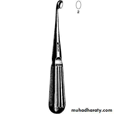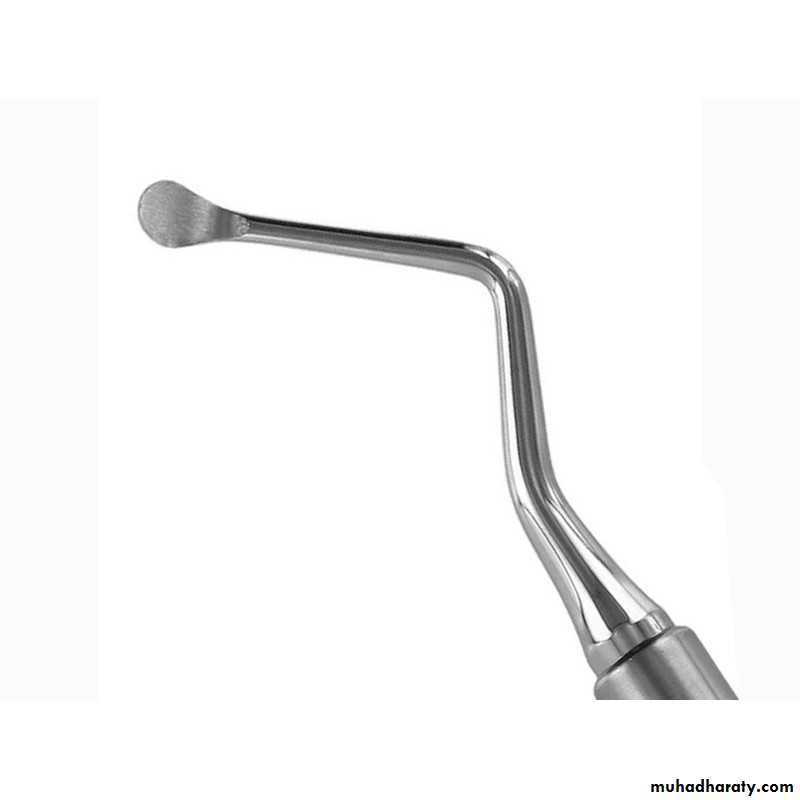 Called Curette : its just like excavator , angled , double ended , of different size , the working end is like a spoon , round-oval in shape , its mostly used to remove soft tissues from a bone cavity like : periapical granuloma or cystic lesion from the bone , it also may be used to remove foreign bodies or small pieces or spicules from the bony socket .