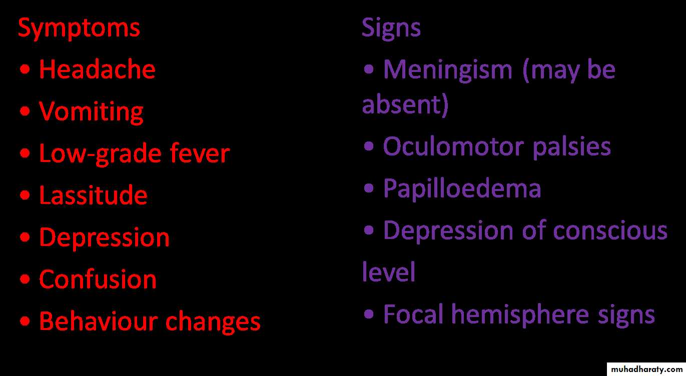 Seizures, raised intracranial pressure and focal hemisphere signs occur alone or in combination. Distinction from a cerebral tumour may be impossible on clinical grounds.