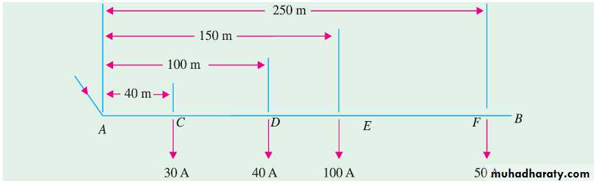 A 2-wire d.c. distributor AB is 300 metres long. It is fed at point A. The variousloads and their positions are given below :