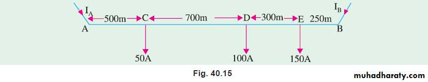 Solution. The distributor along with its tapped currents is shown in Fig. 40.15. Let the current distribution be as shown. Resistance per metre double is = 0.1/1000 = 10−4 Ω. The total drop over the whole distributor is zero because it is fed at both ends by equal voltages