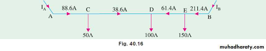 (c) Current in section AC = 88.6 A; Current in CD = (88.6 − 50) = 38.6 ACurrent in section DE = (31.6 − 100) = − 61.4 A