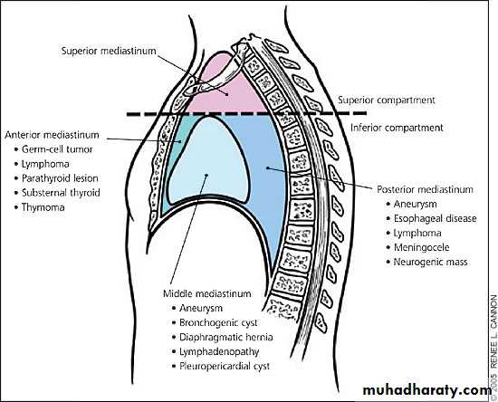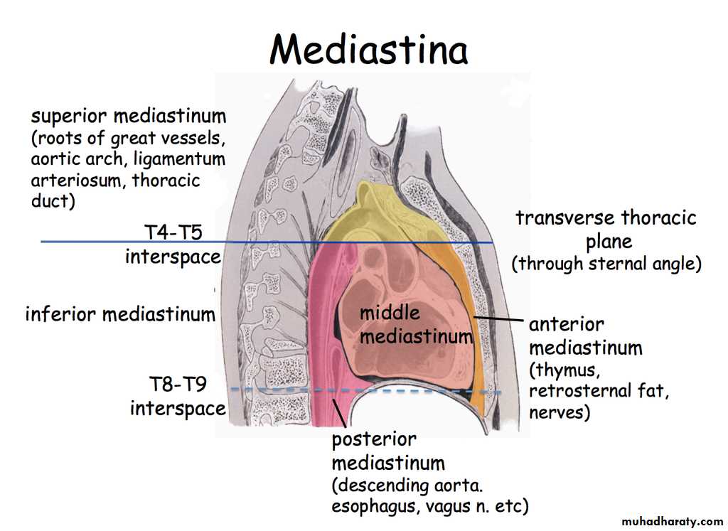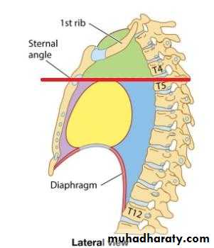 The mediastinum can be divided into parts based on their relationship to the pericardium:*superior mediastinum: is an artificially divided compartment of the mediastinum located between the thoracic plane inferiorly and the thoracic inlet superiorly