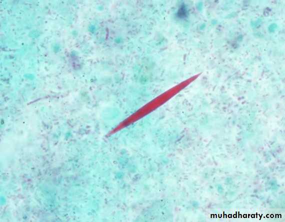 In the stool examination we can find microscopic crystals called charcot-Leyden crystals. It is found in people who have allergic diseases such as asthma or parasitic infections such as parasitic pneumonia or ascariasis. These crystals are formed by the reaction between Charcot-Leyden crystal protein and eosinophil lysophospholipases. They vary in size and may be as large as 50 µm in length. Charcot–Leyden crystals are slender and pointed at both ends, consisting of a pair of hexagonal pyramids joined at their bases. Normally colorless, they are stained purplish-red by trichrome stain to differentiate them from fruits and other crystals. Blood picture revealed Peripheral eosinophilia.