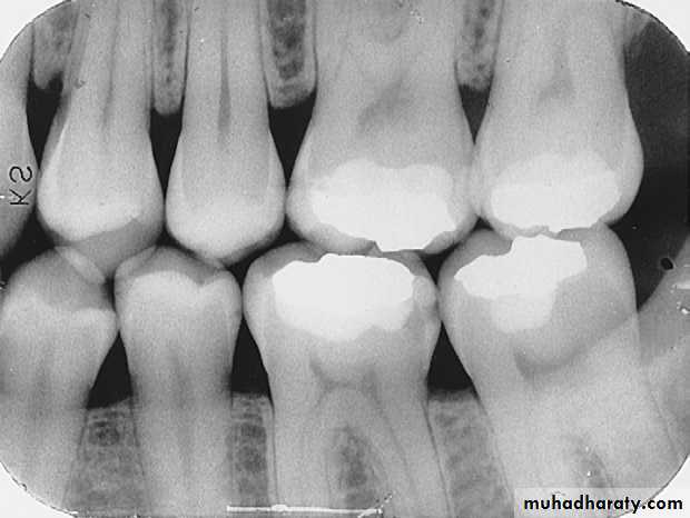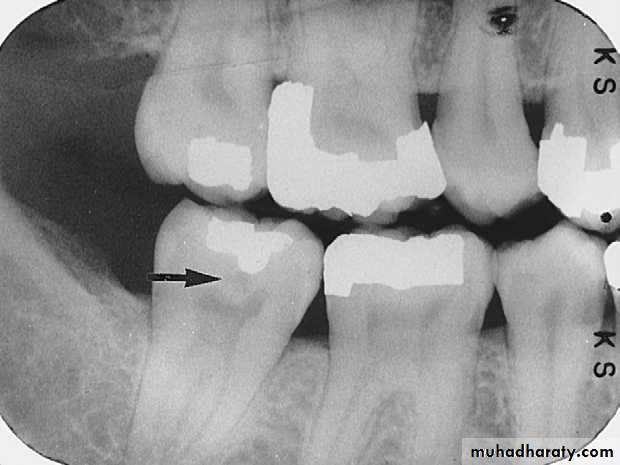 extends into dentin and appears as a large radiolucency.A severe occlusal carious lesion seen as a large radiolucency in dentin on the mandibular first molar