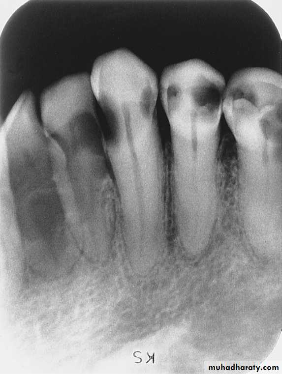 the mandibular second molar.- Saucer-like cratering on the roots of the teeth, involving the cementum. Usually found on older individuals with prominent recession and/or periodontitis. May have xerostomia due to medications.