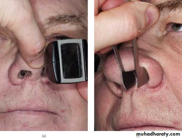 Examine the nasal tip, vestibule, and assess the nasal airwaysNasal tip elevation of nasal tip to see the vestibule.