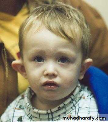 The right pinna pushed forward and downward.Postauricular Hearing aid
