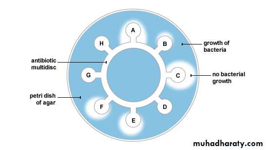 (Each disc for specific antimicrobial agent eg disc for ampicillin and other for gentamicin, amikacin rifampicin …etc) are placed on this culture media. The culture is incubated at 37 C for 24-48 hr according to the type of mo. The test results are red as the followings: