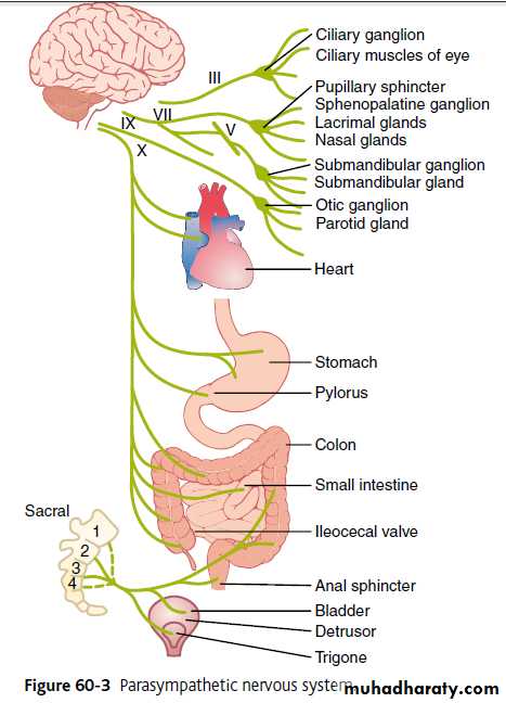 the parasympathetic subdivision also consist of 2 main neurons(similar to the sympathetic division): the one that start from the intermediolateral horns sending its nerve fiber directly to the effector organ is called preganglionic neuron, and a postganglionic neuron which is very short segment (few mm) present in the wall of the effector organ. (this is point of similarity between sympathetic & parasympathetic subdivisions)