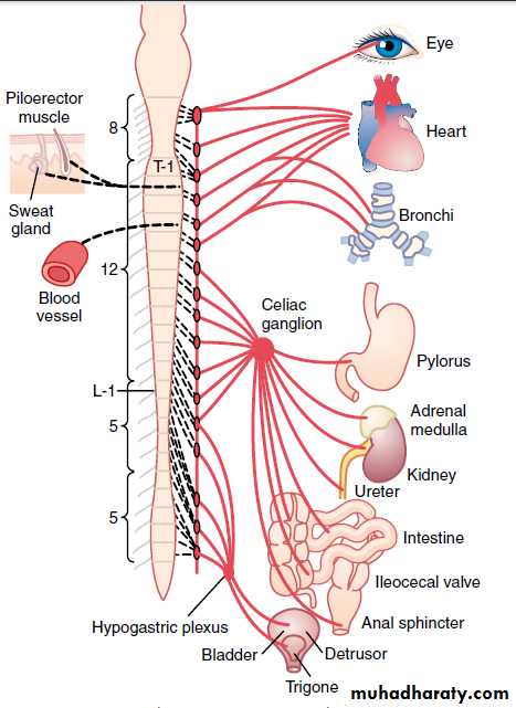 1_sympathetic subdivision: the sympathetic division arises from the spinal cord in between the segments (T1- L2).