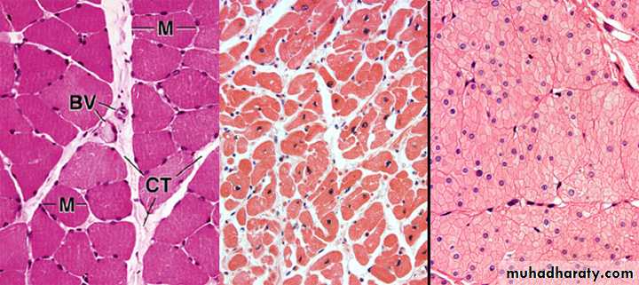 • 1. Be able to identify the three types of muscle at the light microscope level, including distinctive features of each, such as the intercalated disk of cardiac muscle.• 2. Be able to describe the structural basis of muscle striation.