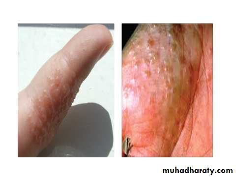 Lesions: very itchy deep seated tiny vesicles along the sides of the fingers, palms, sides, toes, and soles. May coalesce and become bullae, which weep and become painful dry, hyperkeratotic and fissured.Age: Majority under 40 years (range 12 to 40 years).