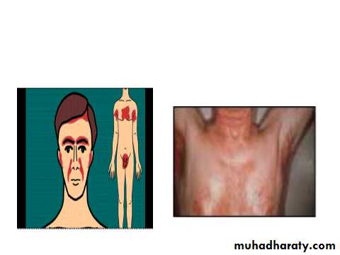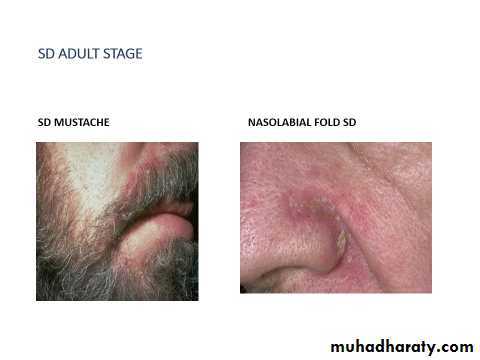 Erythematous patch or plaque covered by greasy yellowish scale, indistinct margin, hair loss uncommon.Most common on scalp, eyebrow, face, mustache, nasolabial folds.