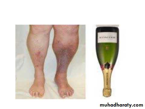 Inverted champagne bottle look to the leg may result from prolong disease ulceration and fibrosis.
