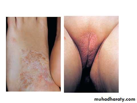 Distribution: especially: back of neck (female), just below elbow, back of hand, genitalia, buttock, and lower leg.