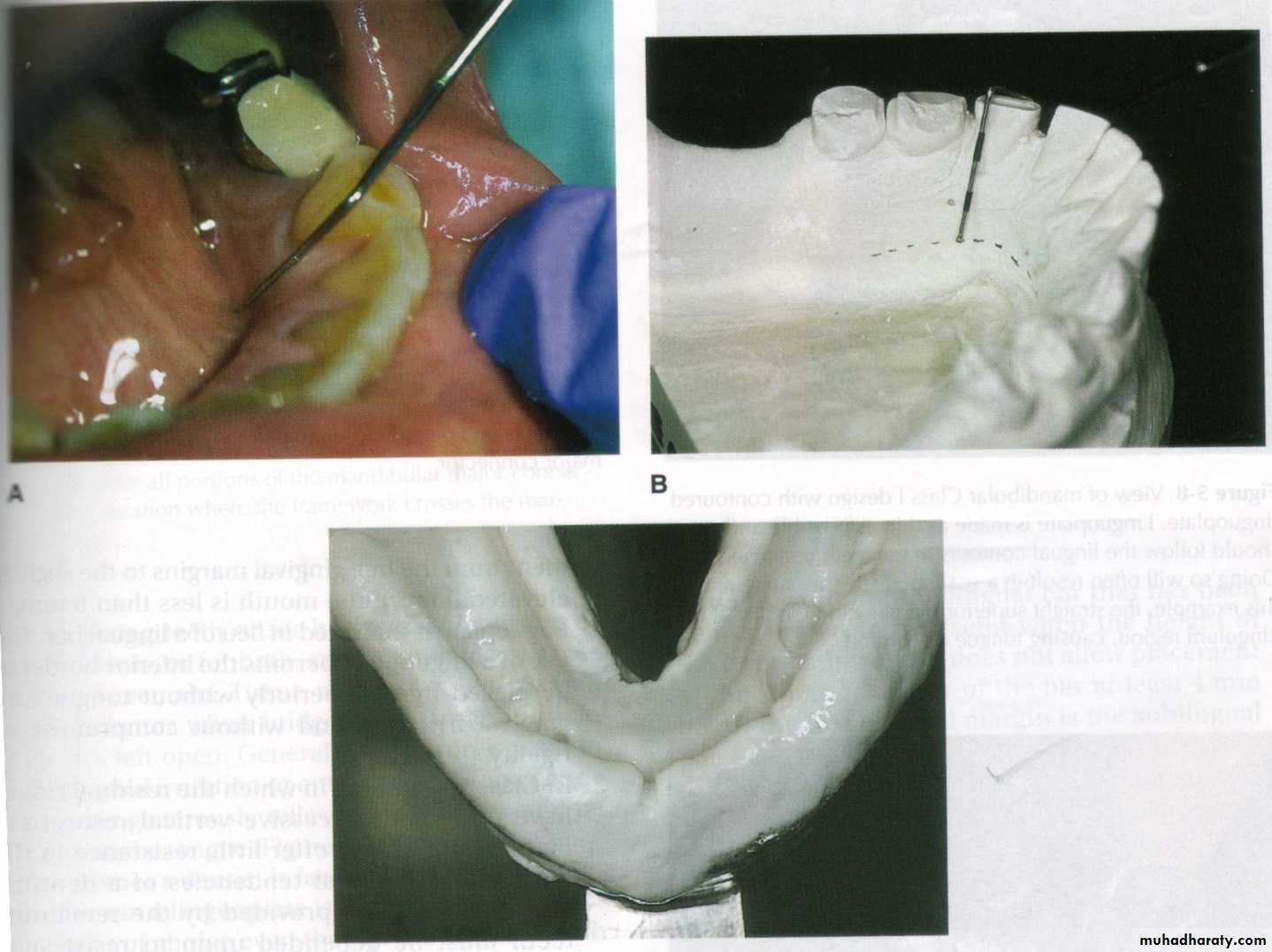 d- An effective specially prepared seal is required along all borders of maxillary major connectors that are in contact with soft tissues. This seal ensures intimate contact with the palatal tissues and prevents food debris from collecting under the connector. Beading of the maxillary cast is essential to develop this peripheral seal. This beading is prepared on the master cast by scrapping a shallow groove (0.5 mm in width and depth) along the borders of the connector.