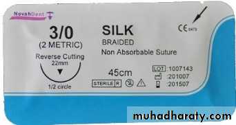 According to the shape of the needles, straight needles are only used where tissues or area of surgery are easily accessible and therefore they are not used in oral cavity because of the limitation of space in oral cavity , so curved needles are mostly used of a length of 21-25mm or 3/8 or 1/2 ( half circle ) and this design allows the needle to pass through the limited area of suturing easily , the cutting needle ( triangular cross section) also called traumatic needle but it has a good advantage of being able to enter the tissues easily during suturing specially in tout area like mucoperiosteum of the hard palate ( keratinized mucosa) or skin where the tissue is difficult to penetrate , the tapered needle is generally used for closing muscle or fascia that are easily penetrated .