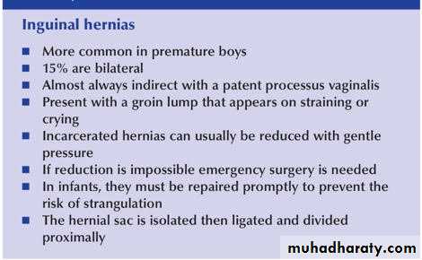 Inguinal hernias do not spontaneously heal and must be surgically repaired because of the risk of incarceration. Generally, a surgical consultation should be made at the time of diagnosis, and repair (on an elective basis) should be performed very soon after the diagnosis is confirmed (within one week)