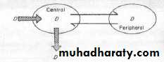 This model considers the body as it is consists of 2 compartments: a smaller central one and a larger peripheral one, between which drug exchanges occurs. The central compartment is often equated with the blood, but in fact it includes all those tissues and organs with which the drug is in rapid equilibrium (heart, kidney, liver, lungs) while the peripheral one (skin, muscles and fat)Drug distributes to peripheral compartments in a reversible manner ( ) .
