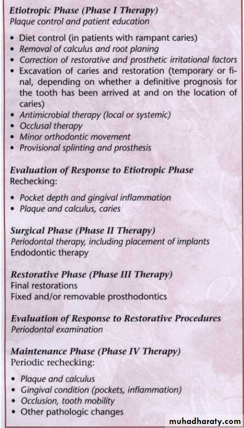 Reevaluation of the periodontal case should occur about 4 weeks after the completion of scaling and root planning procedures. This permits time for both epithelial and connective tissue healing, correction of conditions such as overhanging margins and sufficient practice with oral hygiene skill so that the dentist can accurately assess the periodontal condition at the end of phase I therapy.