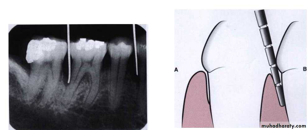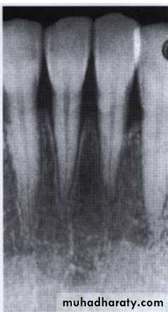 Break in the continuity of lamina dura these result from the extension of gingival inflammation into the bone causing widening of the vessel channels and a reduction in calcified tissue at the septal margin.A wedge-shaped radiolucent area is formed at the mesial or distal aspect of the.