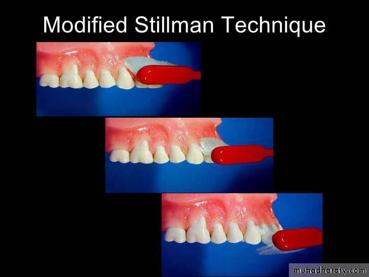 Brush be placed with bristle ends resting partly on the cervical portion of the teeth and partly on the adjacent gingiva at an oblique angle to the long axis of the teeth. The brush move about 20 short back-and-forth strokes while simultaneously moving it coronally along the attached gingiva, the gingival margin and tooth surface. A soft or medium brush should be used with this technique to minimize trauma to the gingiva.
