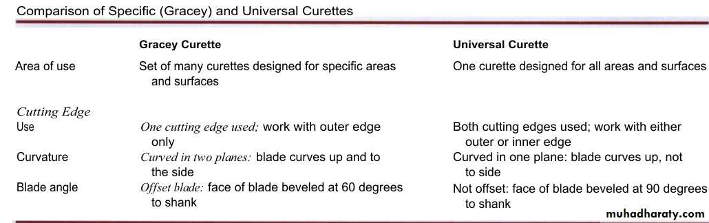 Universal curettes can be inserted in most areas of dentition, the face of the blade is at a 90-degree angle (perpendicular)