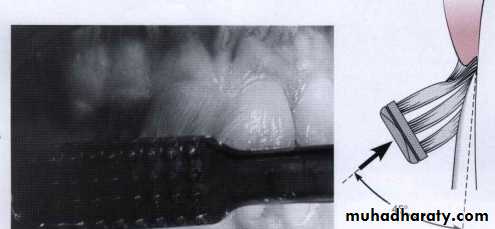 Place the bristles at the gingival margin establishing an angle of 45 degree to the long axis of the teeth using short back-and-forth motions without dislodging the tips of the bristles. This motion forces the bristle ends into the gingival sulcus area as well as partially into the interproximal embrasures. To help reach the lingual surfaces of the anterior teeth insert the brush vertically.