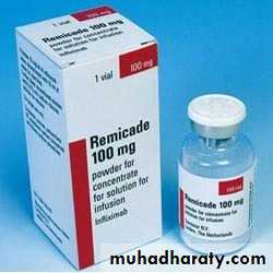 Infliximab (anti-TNF monoclonal antibody ) given as an intravenous infusion 4-8-weekly on three occasions induces remission in patients with active Crohn's disease at any site within the gastrointestinal tract and is also effective for the management of some extraintestinal complications including pyoderma gangrenosum and some forms of arthritis. combined with disease-modifying agents, either thiopurines or methotrexate, to maintain remission.