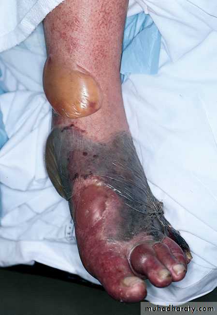 Gas gangrene. Note large area of necrosis on lateralaspect of foot. Necrosis mainly caused by lecithinase producedby Clostridium perfringens . Gas in tissue is a feature of gangrene producedby this anaerobic bacteria. A large gas and fluid-filled bulla isseen near the ankle. (Used with permission from David Kaplan, MD