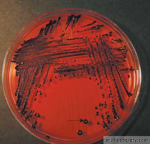 P revotella melaninogenica— black pigmentedcolonies. Arrow points to a black pigmented colony of Pre. melaninogenica. (Used with permission from Professor Shirley Lowe, University of California,San Francisco School of Medicine.)