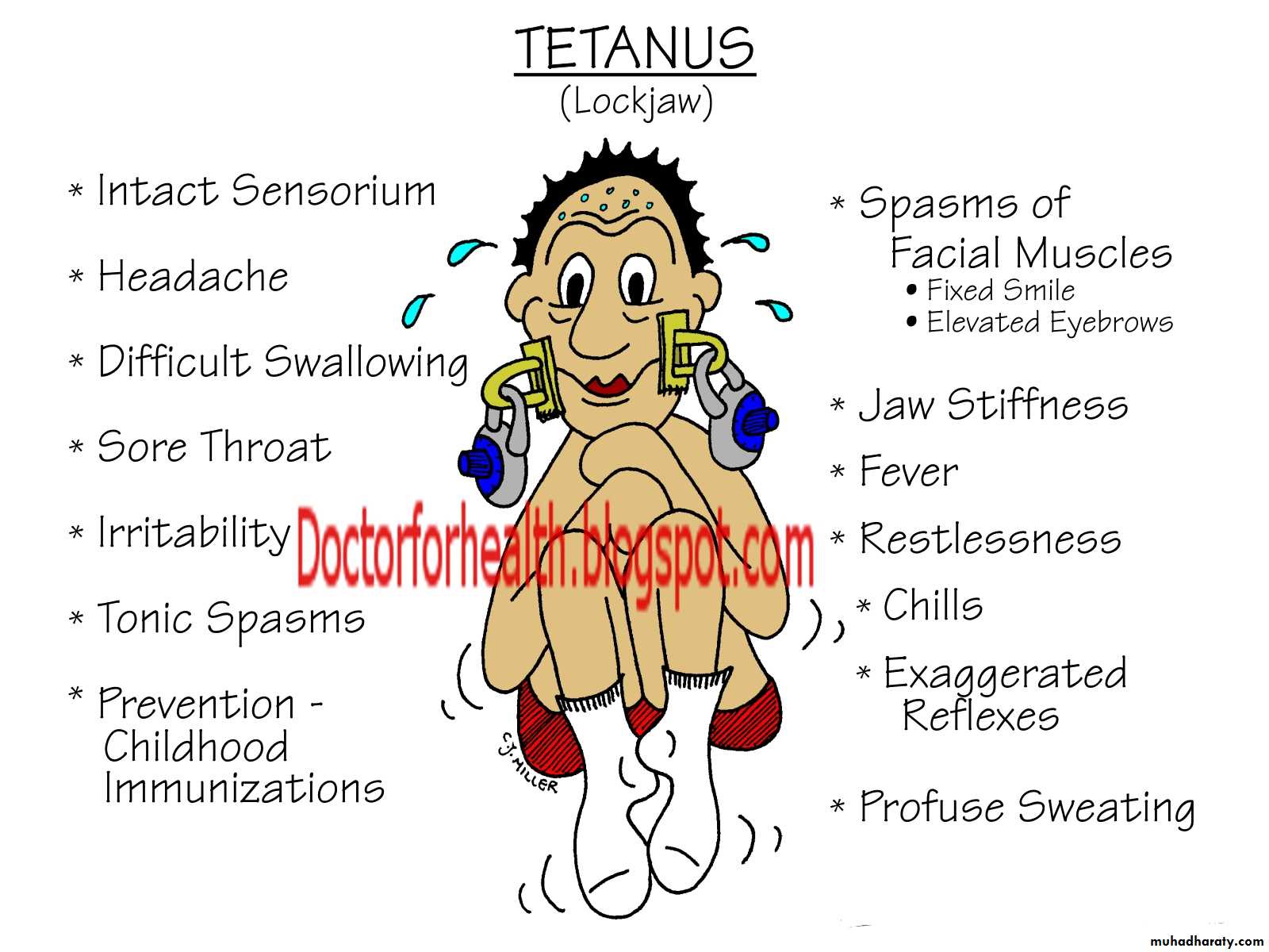 Tetanus is characterized by strong muscle spasms (spastic paralysis, tetany). Specific clinical features include lockjaw (trismus) due to rigid contraction of the jaw muscles,which prevents the mouth from opening, a characteristic grimace known as risus sardonicus, and exaggerated reflexes..